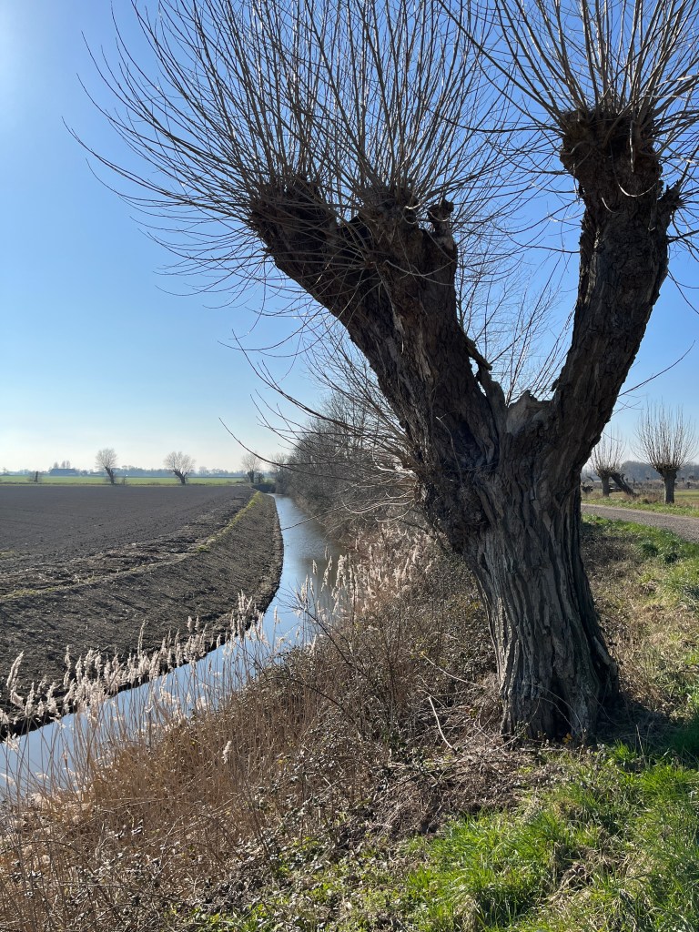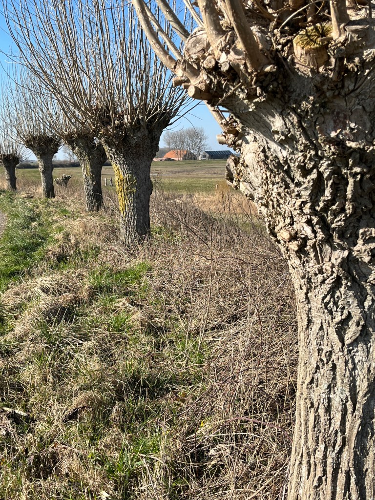 Vanmiddag maakte ik weer eens een wandeling over het dijkje van de al meer dan 400 jaar oude polder bij ons huis. Op de dijk staan mijn lievelingsbomen, knotwilgen. Stoer in grillige vormen, sommige geknot anderen met hun kale takken naar de hemel reikend.
