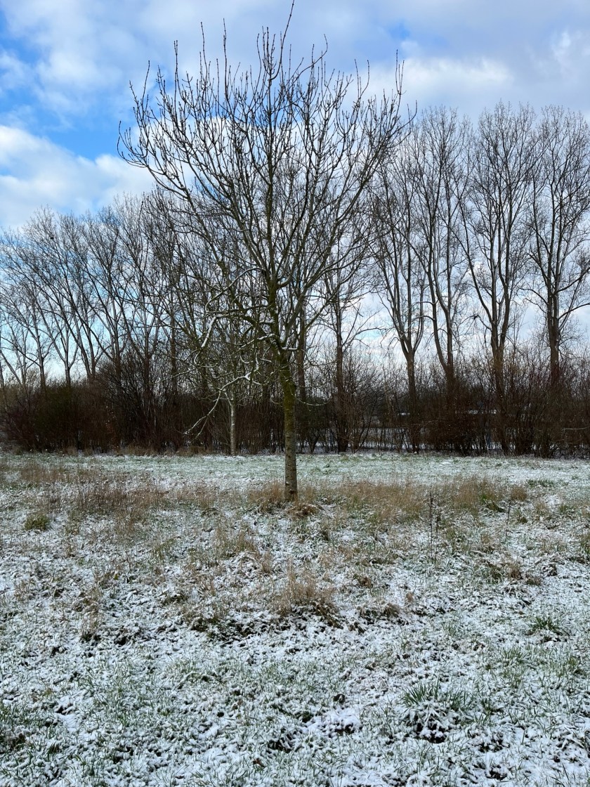 Vanochtend vroeg was het stil en verstard toen ik buiten liep. De ochtenden zijn zo mooi. De stilte en het ‘onaangetaste’ pad, waar Monty en ik als eerste onze poot-en voetstappen achterlieten. Het landschap was twijfelend wit gekleurd: op sommige plekken een spotje andere delen waren geheel wit gepoederd. Ik kreeg heel veel winterzin.