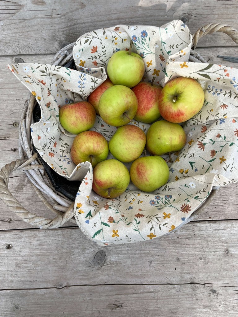 De boom draagt dit jaar minder fruit dan vorig seizoen en er zitten heel veel kleintjes, misschien door de droogte of de luizenplaag uit het voorjaar? Maar niet getreurd het zijn er nog ruim genoeg voor appeltaart, cake, in de havermoutpap en natuurlijk zo uit het vuistje. Een eerste mand was snel gevuld de rest komt wel in het weekend.