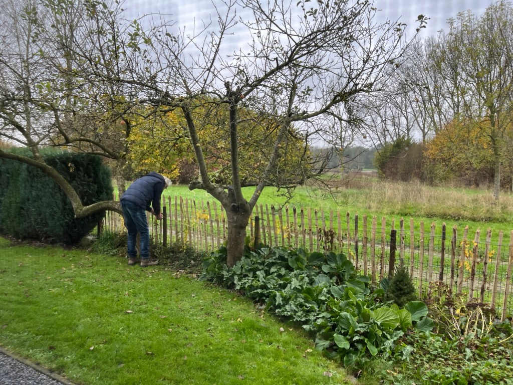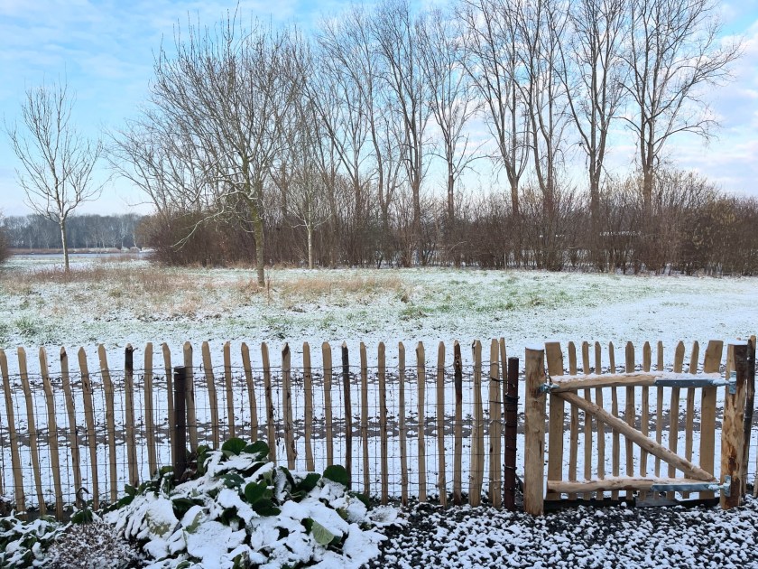 Van de boerderijshop waar we een eerste rol met de kastanjehouten puntige (daarin zit het verschil met het Engelse schapenhek met stompe punten) voor het uittesten hadden gehaald, begrepen we dat de bodem eerst wat droger moest worden voor dat de palen er in konden. In te zompige (vind ik zo een mooi woord in het Zeeuws) zware kleigrond die we hier hebben kunnen ze namelijk niet boren voor de houten palen.