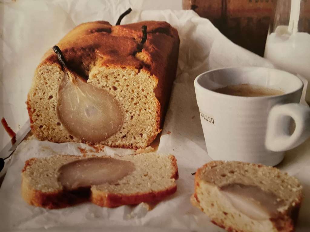 Schil de peren, laat de steel eraan zitten. Klop de boter, suiker en eieren 5 min luchtig. Voeg daarna de bloem, het bakpoeder en het cappucinopoeder toe aan het beslag. Bekleed de cakevorm met bakpapier. Verdeel het cakebeslag in de vorm.